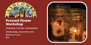 Break up the weekday grind with a wonderful Wednesday evening of creativity and fun. Grab a friend, family member, neighbor, coworker and join us to make pressed flower luminaries during Ashcombe’s Ladies’ Night. Spend an hour learning about the ancient art of flower pressing while you create your own pressed flower glass luminary to take home and enjoy all winter long!